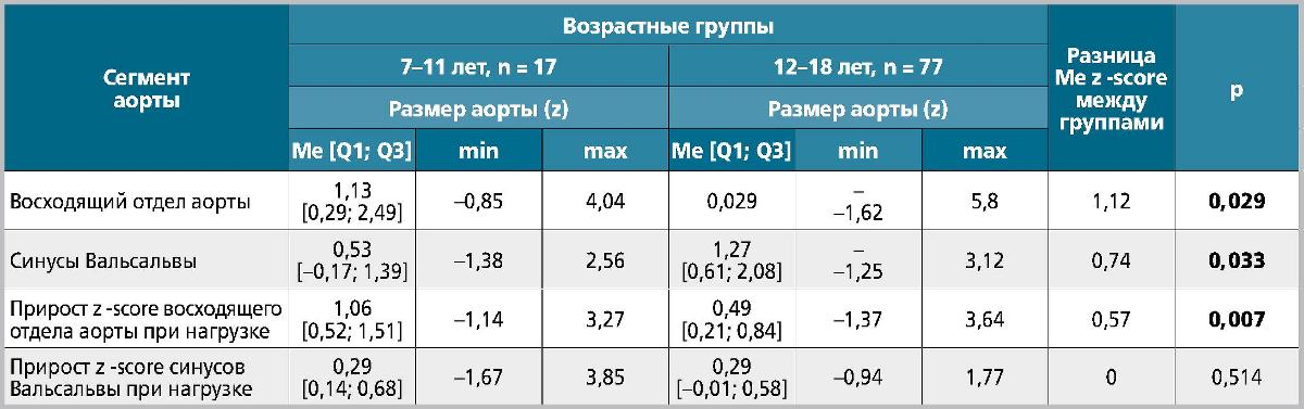 У детей такие диаметры аорты, как у взрослых, не встречаются, а четкие рекомендации отсутствуют. Тем не менее эпизоды диссекции также описываются [3, 9], а оперативные вмешательства предпринимаются [10]. Таким образом, необходим иной подход к оценке состояния аорты, учитывающий нормативы, свойственные именно педиатрическому периоду и отражающий нелинейную связь роста аорты и самого ребенка. В связи с этим большинство исследователей используют такой показатель, как z-score (z-фактор). При измерениях в данных единицах считают, что величина более 2 z-score отражает небольшое расширение аорты, >3 z-score - умеренное, а >4 z-score - резкое (фактически аневризму аорты) [11].