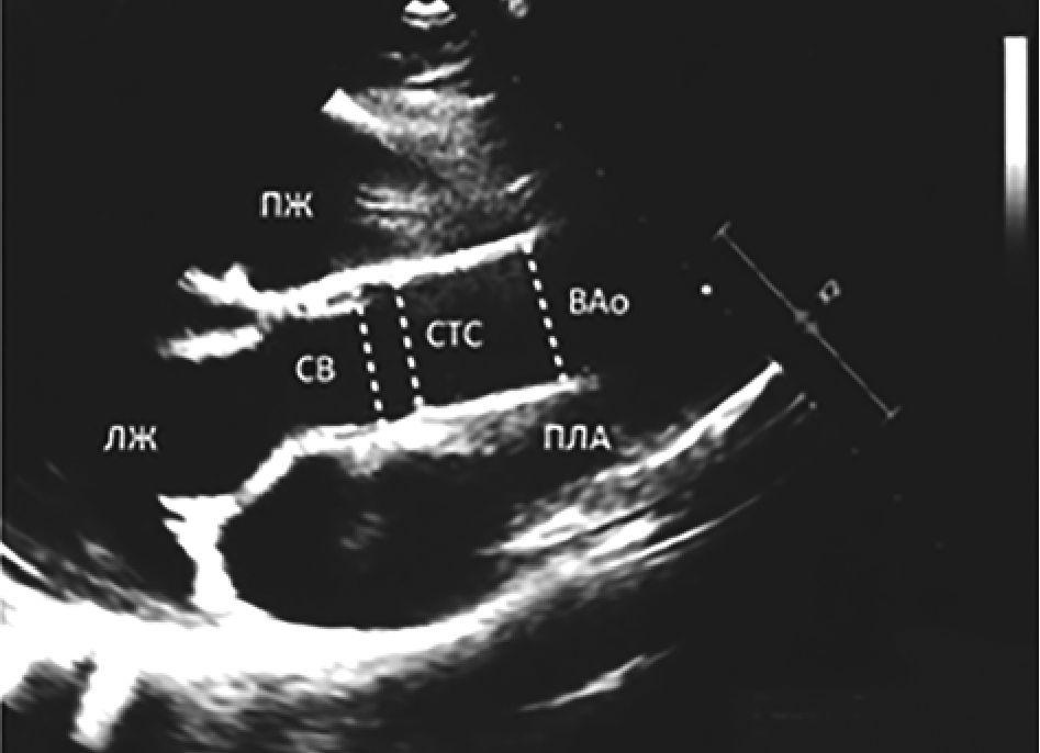 Аорту измеряли по ее внутреннему диаметру на трех основных уровнях (СВ, СТС и ВАо) в систолу в парастернальной позиции по длинной оси левого желудочка (рис. 1).