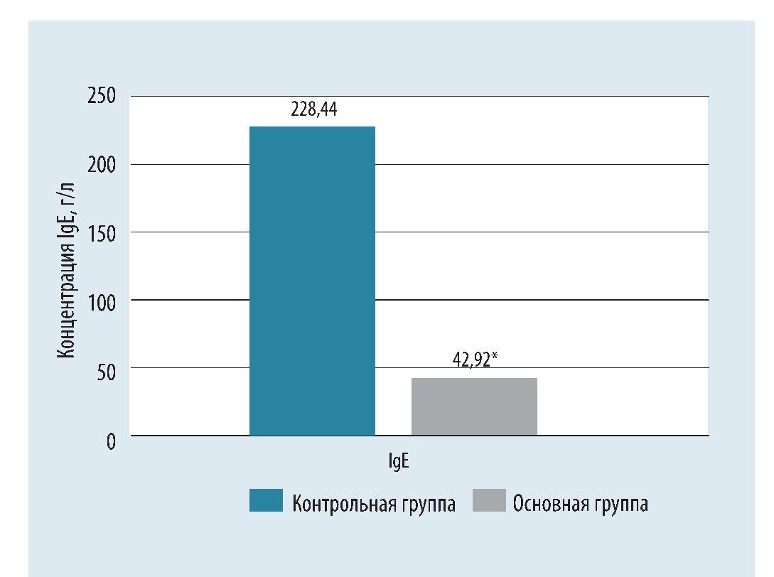 У пациентов основной группы для всех изучаемых показателей, за исключением концентрации IgE (p = 0,415), достигнуты статистически достоверные изменения на фоне проводимой терапии (р < 0,05) (рис. 1).