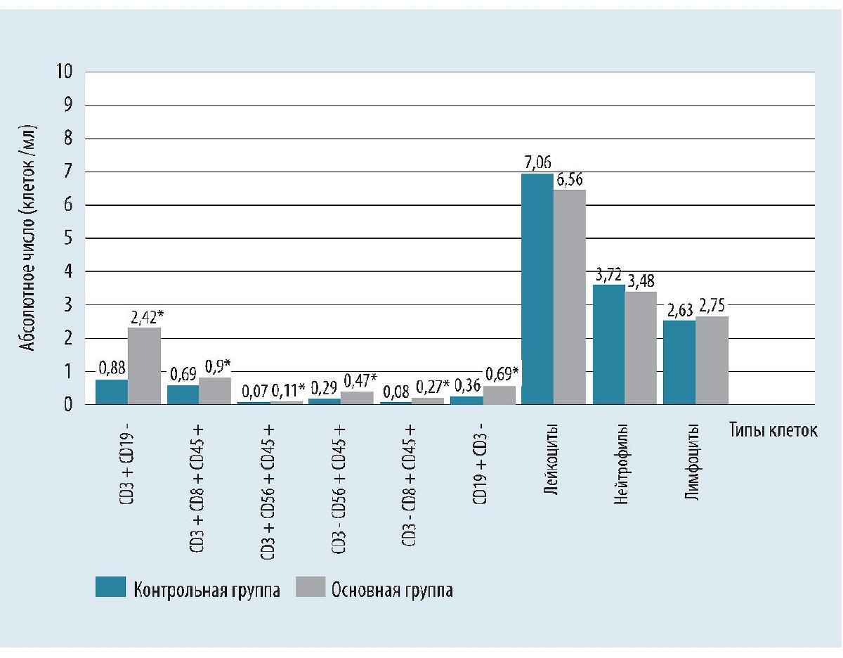 У пациентов контрольной группы для ряда изучаемых показателей достигнута статистически достоверная (р < 0,05) динамика. Увеличение (рост) показателей выявлено для доли (%) Т-цитотоксических клеток (CD3+CD8+CD45+), а также концентрации клеток и доли (%) NK-киллеров (CD3+CD56+CD45+). Снижение показателей выявлено для: соотношения Т-хелперы/Т-цитотоксические клетки (CD3+CD4+/ CD3+CD8+); доли (%) Т-лимфоцитов (CD3-CD19+) и нейтрофилов.