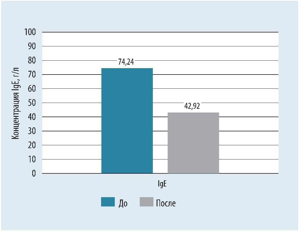 Рис. 5. Динамика концентрации иммуноглобулина Е (IgE) у пациентов основной группы по результатам 10 дней лечения.