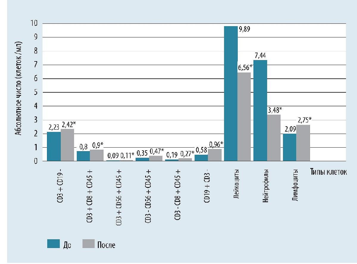 • рост CD3+CD8+CD45+ цитотоксических Т-лимфоцитов (p=0,005) и NK-клеток (CD3-CD56+CD45+, p = 0,001), критичных для элиминации инфицированных клеток;