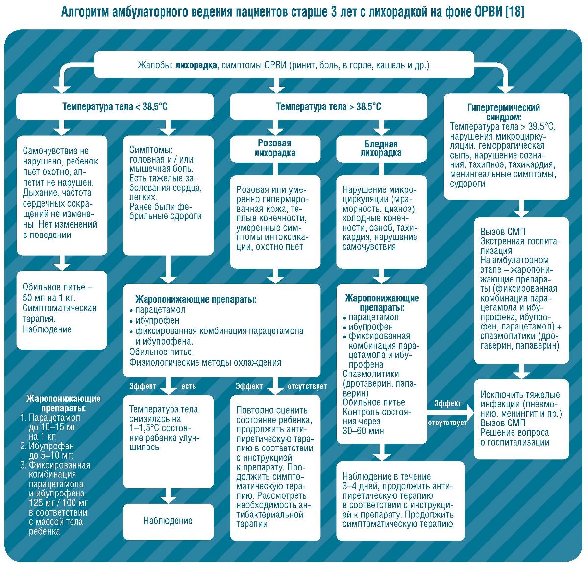 Summary. Acute respiratory infections are widespread among children, and fever is one of their main symptoms. Although fever is an evolutionary defense mechanism that helps the body fight infection, it often causes unfounded concern among parents and physicians, leading to excessive and irrational use of antipyretics. There is a significant gap between official recommendations, which advise reducing temperature mainly above 39 °C or in cases of poor tolerance, and real clinical practice, where therapy is often prescribed at lower values. On the other hand, excessive or prolonged hyperthermia, especially above 40 °C , is dangerous and can cause damage to the central nervous system and other organs. Only ibuprofen and paracetamol are recommended as antipyretic drugs for children, with emphasis on the risks of their overdose and the importance of dose adherence. Modern meta-analysis data indicate that combination therapy with these two drugs provides a more sustained and pronounced effect compared to monotherapy, without increasing the risk of side effects. It is noted that the use of a fixed combination allows achieving a therapeutic effect at significantly lower doses, reducing the drug load on the child's body. An important part of therapy is distinguishing between "pink" and "pale" fever, with the latter having reduced effectiveness of antipyretics and requiring additional administration of antispasmodics. To unify treatment approaches, work has been initiated in 2024 to develop a consensus and create a standardized algorithm for physicians.