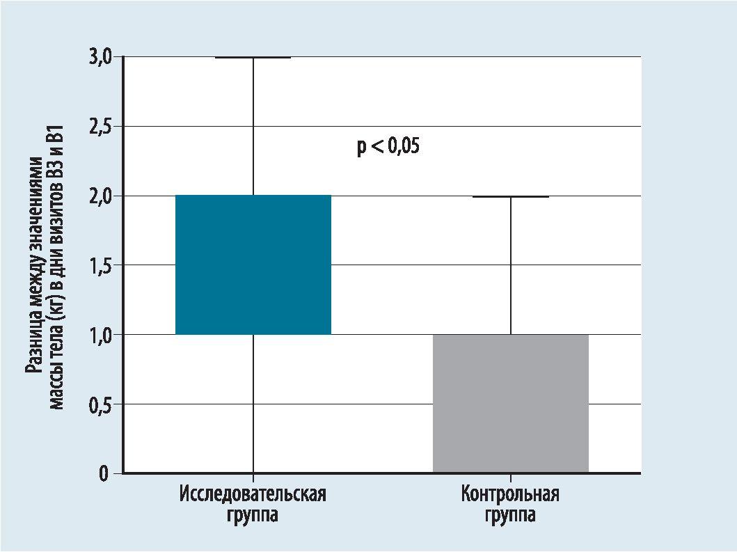 В обеих группах отмечались положительные средние прибавки массы тела во время исследования. Важно отметить, что в группе 1 прирост среднего значения массы тела пациентов к завершению исследования был более значимым, чем в группе 2 (+1,35 кг vs 0,71 кг, Equal-Variance