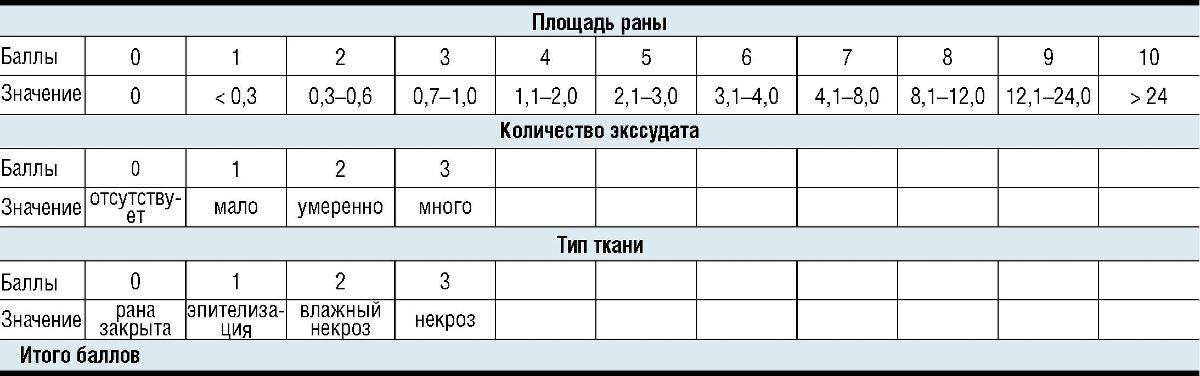 Применялась балльная оценка трех измеряемых параметров: площадь раны (наибольшая длина x наибольшая ширина = площадь поверхности раны); количество экссудата (оценивается как легкое, умеренное или сильное после снятия повязки); тип ткани (закрытая, эпителиальная ткань, грануляция, некротическая ткань / струп) (табл. 1).