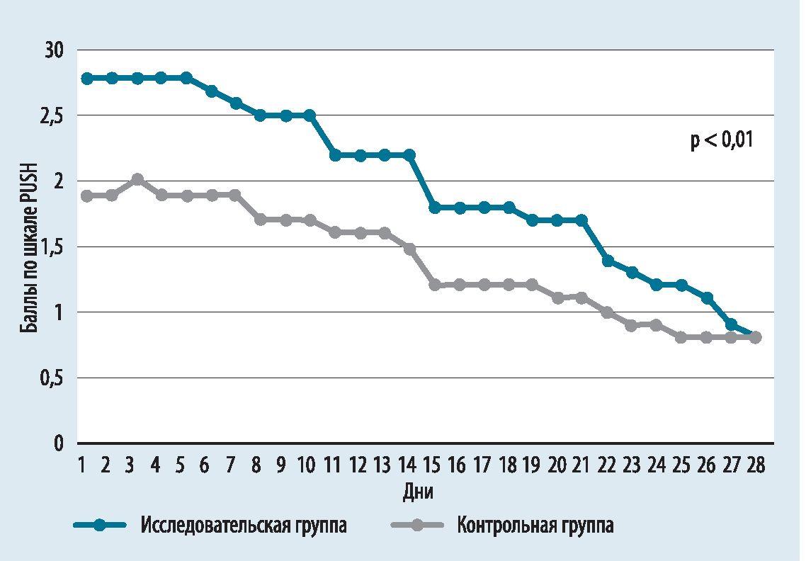 В нашем исследовании вследствие рандомизации пациентов исходно в исследовательской группе пролежни были существенно более тяжелыми, чем в контрольной группе. Так, средняя продолжительность наличия пролежня у пациентов к дате включения в группу 1 составила 113 дней, а в группе 2 - 43,6 дня. Превалировала также средняя площадь пролежня в исследовательской группе, которая составляла 27,6 см2, а в контрольной группе - 10,2 см2. Среднее число баллов шкалы PUSH по типу ткани в исследовательской группе составляло 2,8, а в контрольной группе - 1,9.
