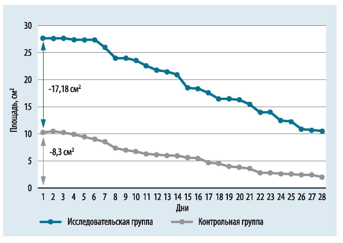 Исследователи ежедневно измеряли и регистрировали в дневниках площадь пролежня у пациентов в обеих группах. На визите 1 исходные средние значения площади пролежня в группах существенно различались. В группе 1 отмечались более высокие показатели величин - 27,59 ± 30,68 см2, чем в группе 2 - 10,23 ± 11,12 см2 (табл. 2).