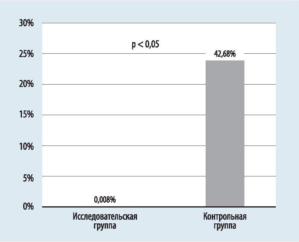Однако статистической значимости выявленных различий обнаружено не было по причине большого разброса значений и высокого значения стандартного отклонения. Так, в исследовательской группе площадь пролежня варьировала от 2 см2 до 120 см2, а в контрольной - от 0,25 см2 до 42 см2.