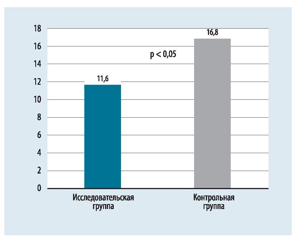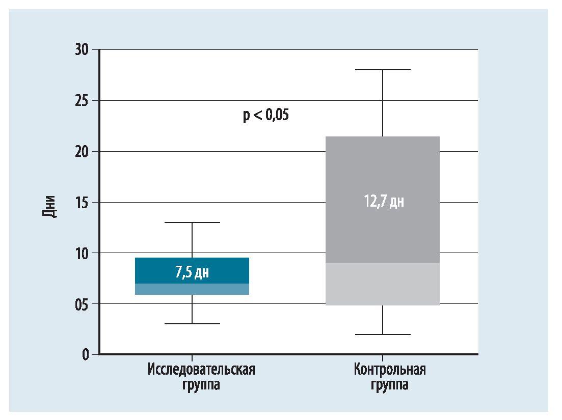 Дополнительно определялось количество дней до появления положительной динамики в ране по каждому пациенту. В исследовательской группе это значение в среднем составило 11,6 дней, в контрольной группе - 16,8 дней. Указанное различие между группами достигло статистической значимости (Equal-Variance T-Test и Aspin-Welch Unequal-Variance T-Test); p < 0,05, power 0,64) (рис. 8).
