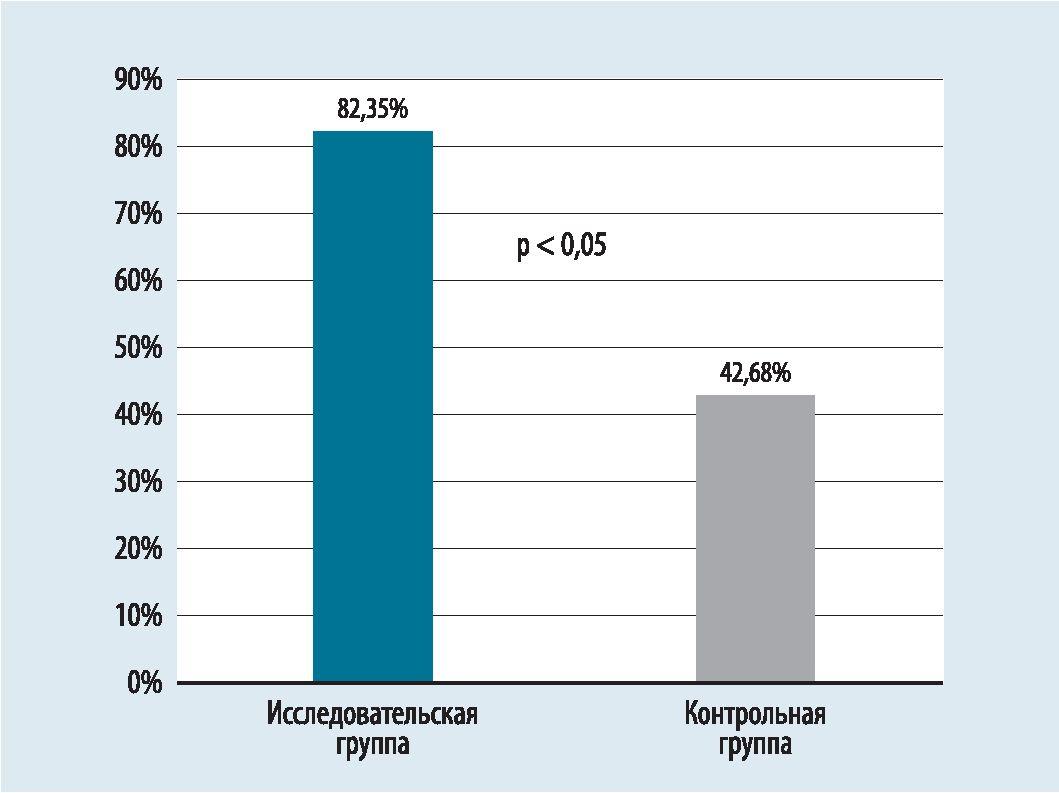 T-Test, Aspin-Welch Unequal-Variance T-Test, Mann-Whitney U или Wilcoxon Rank-Sum Test, р < 0,05, power 0,54), (рис. 1). Кроме того, в исследовательской группе доля пациентов с увеличившимся весом составила 82,35%, а в контрольной группе - 42,86% (метод Pearson's Chi-Square, Fisher's Exact, p < 0,05), (рис. 2).