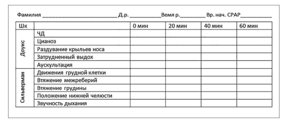 Исследователь проводил одновременную оценку ДН в родильном зале по шкалам Доунс (табл. 1) и Сильверман (табл. 2) при старте СРАР-терапии, на 20-й, 40-й и 60-й минутах проведения респираторной терапии.