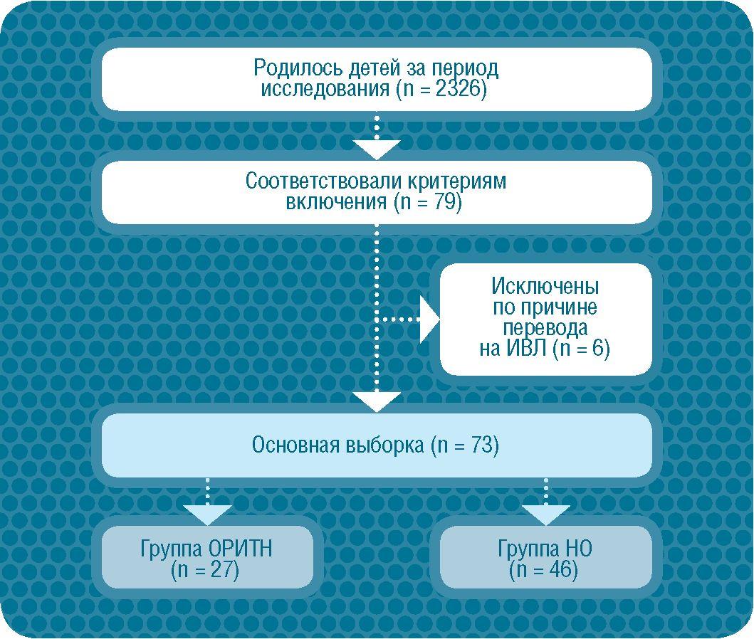 Всего за период исследования родилось 2326 детей, из них в ГВ 35° недель и более 2051 ребенок. Критериям включения в исследования соответствовали 79 детей. Шестеро новорожденных (7,5%) переведены на ИВЛ в родильном зале спустя 1-10 мин после начала СРАР-терапии и исключены из исследования. В итоге основную выборку составили 73 ребенка (рис. 3).