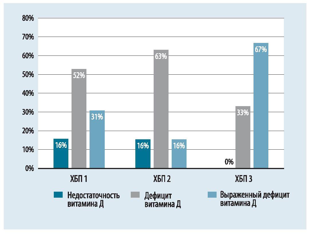 Рис. 3. Доля пациентов с пониженным уровнем 25(ОН)Д в крови в зависимости от стадии ХБП