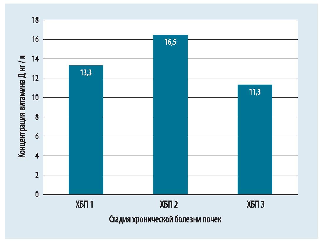 Рис. 4. Изменение уровня 25(ОН)Д в крови в зависимости от стадии ХБП