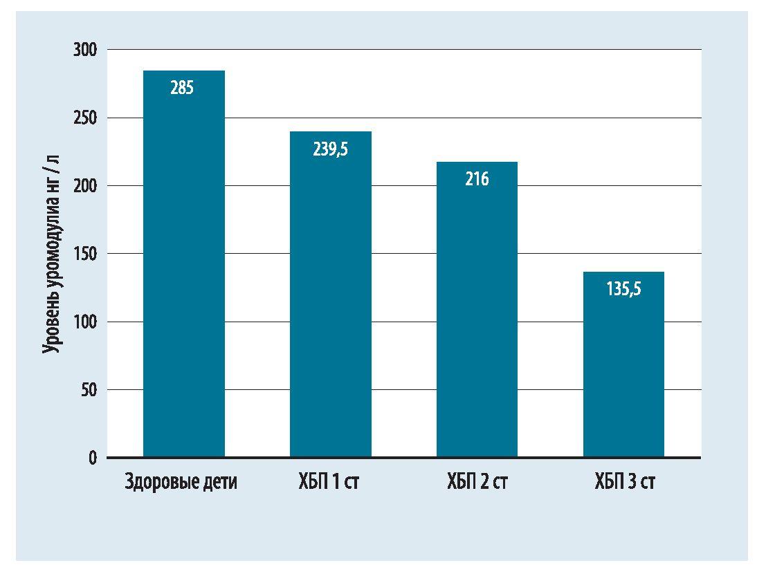 Как показали исследования последних лет, новым и современным маркером для прямого определения функционирования почек является UMO. Этот гликопротеин, также известный как белок Тамма - Хорсфалла, имеет исключительно почечное происхождение, секретируется клетками толстой восходящей части петли Генле и часть его попадает в кровоток [3]. Уромодулин связан с поддержанием баланса воды и электролитов, участием почек в поддержании неспецифических факторов резистентности и, как полагают, препятствует возникновению мочевых инфекций и образованию в почках конкрементов. При ухудшении функции почек концентрация маркера понижается [3-5]. Уровень UMO ниже 100 нг/мл в сыворотке указывает на сниженную деятельность почек, что прямо и линейно коррелирует с индексом СКФ [6, 7]. UMO занимает уникальное место среди биомаркеров ХБП, так как в первую очередь отражает состояние фенотипа канальцевого эпителия и развитие тубулоинтерстициального фиброза. При заболеваниях почек разной природы наблюдается опережающее развитие интерстициального, а не гломерулярного склероза, что и определяет скорость прогрессирования хронической почечной недостаточности (ХПН). UMO является более чувствительным и ранним маркером потери почечной функции, так как его снижение наблюдается еще при нормальной СКФ. С его помощью можно определить разницу между контрольным замером у здоровых людей и первой стадией хронического почечного заболевания [8]. Также этот маркер полностью независим от возрастных и половых различий, мышечной массы, потребленного накануне белка и индекса массы тела [6]. Очень быстр и точен в исполнении: нет необходимости собирать мочу 24 часа, производить вычисления и корреляции, есть возможность выполнять на автоматическом анализаторе. Информация по изучению роли UMO в прогнозировании течения ХБП у детей в доступной литературе практически отсутствует.