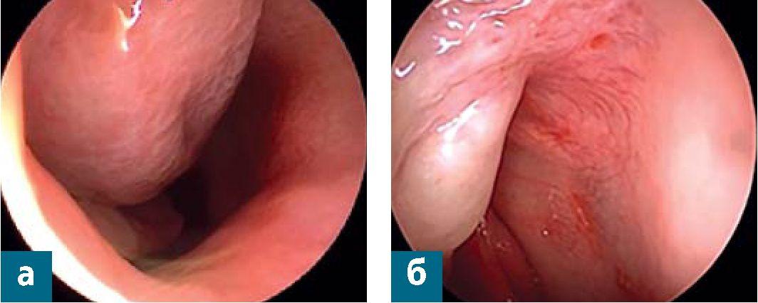 Рис. 5. Эндоскопическая фотография образования правой половины носа до хирургического лечения: а - образование сдавливает нижнюю носовую раковину; б - место крепления образования в правой половине полости носа