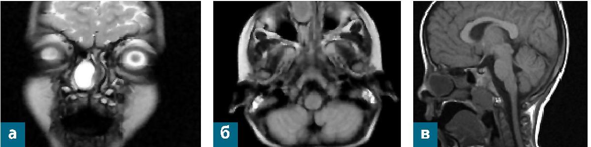По данным МРТ головного мозга выявлены признаки кистозного образования полости носа и ОНП справа (рис. 3).