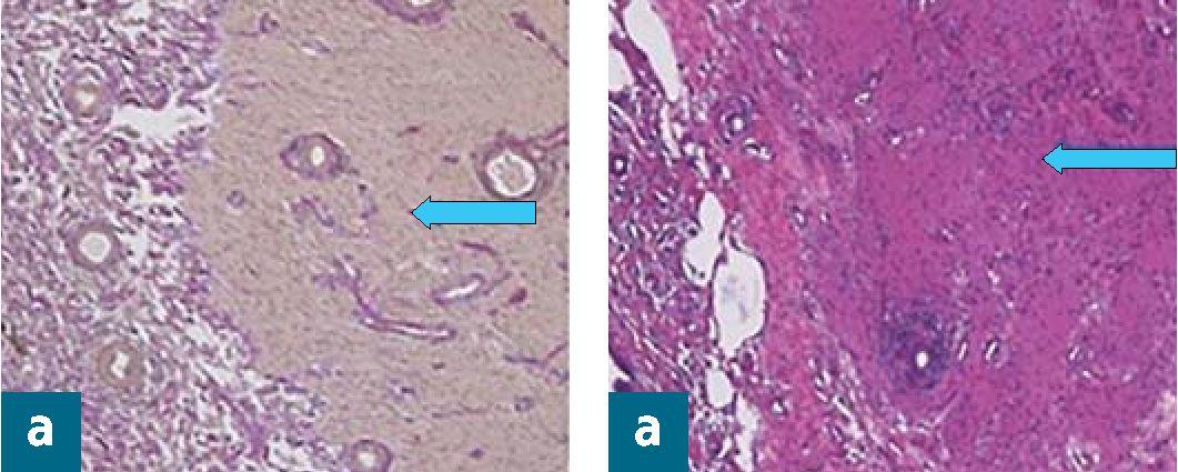 При гистологическом исследовании обнаружены участки зрелой глиальной ткани, окруженные фиброзной капсулой. Также визуализируются фрагменты слизистой оболочки, выстланной многорядным мерцательным эпителием и многослойным плоским неороговевающим эпителием, с наличием серозно-слизистых желез. При окраске по Ван-Гизону выявляются очаги, проявляющие пикринофилию (окрашиваются в желто-зеленый цвет). Морфологическая картина соответствует глиальной гетеротопии (рис. 6).