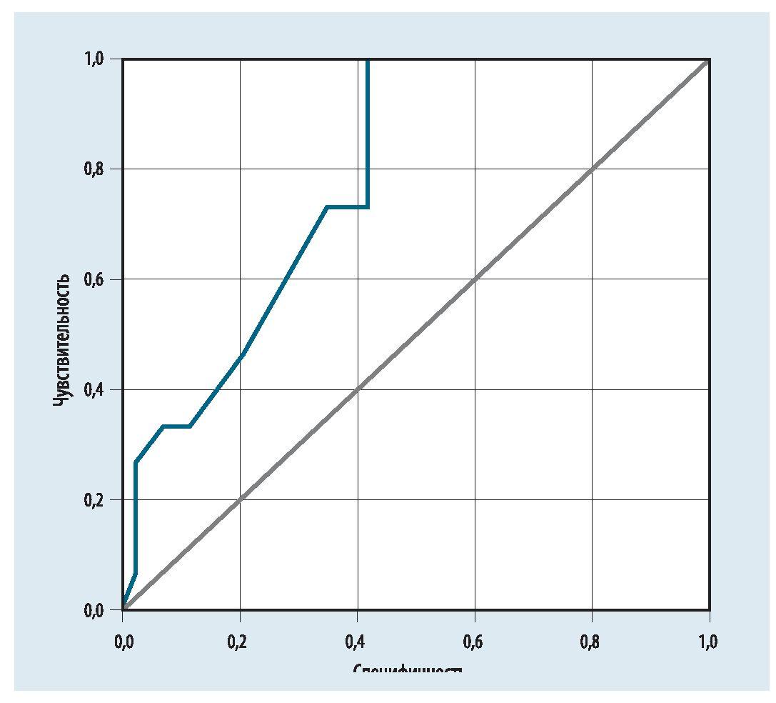 При использовании логистического анализа были получены следующие данные. Значения чувствительности в латентном значении I пика составило 53,8%, специфичности 67,9%. Полученный расчет показывает, что применять данные показатели в прогностических целях нецелесообразно.